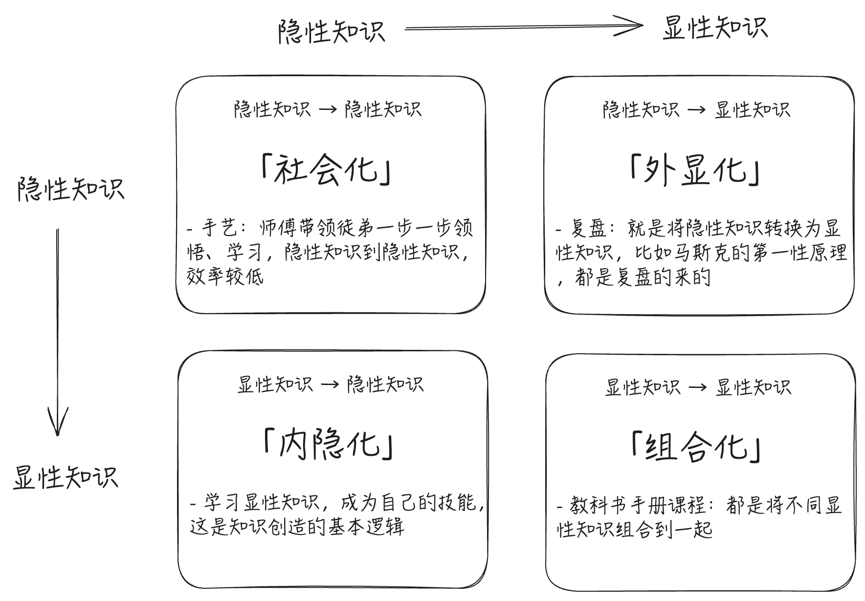 复盘,将隐性知识转换为显性知识(外显化),多次复盘之后,又能把显性知识组合在一起(组合化),成员各自学习,内化成自己的隐性技能(内隐化)。