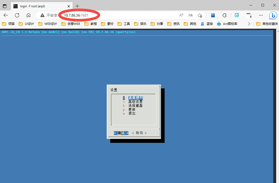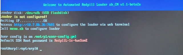 看到显示器最后一行显示“root@arpl…”表示编译系统已启动好,查看获取到的内网IP,我们通过这个IP在另一台电脑的浏览器中访问这个编译系统。