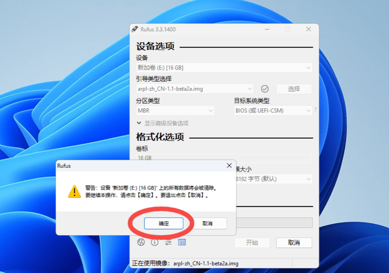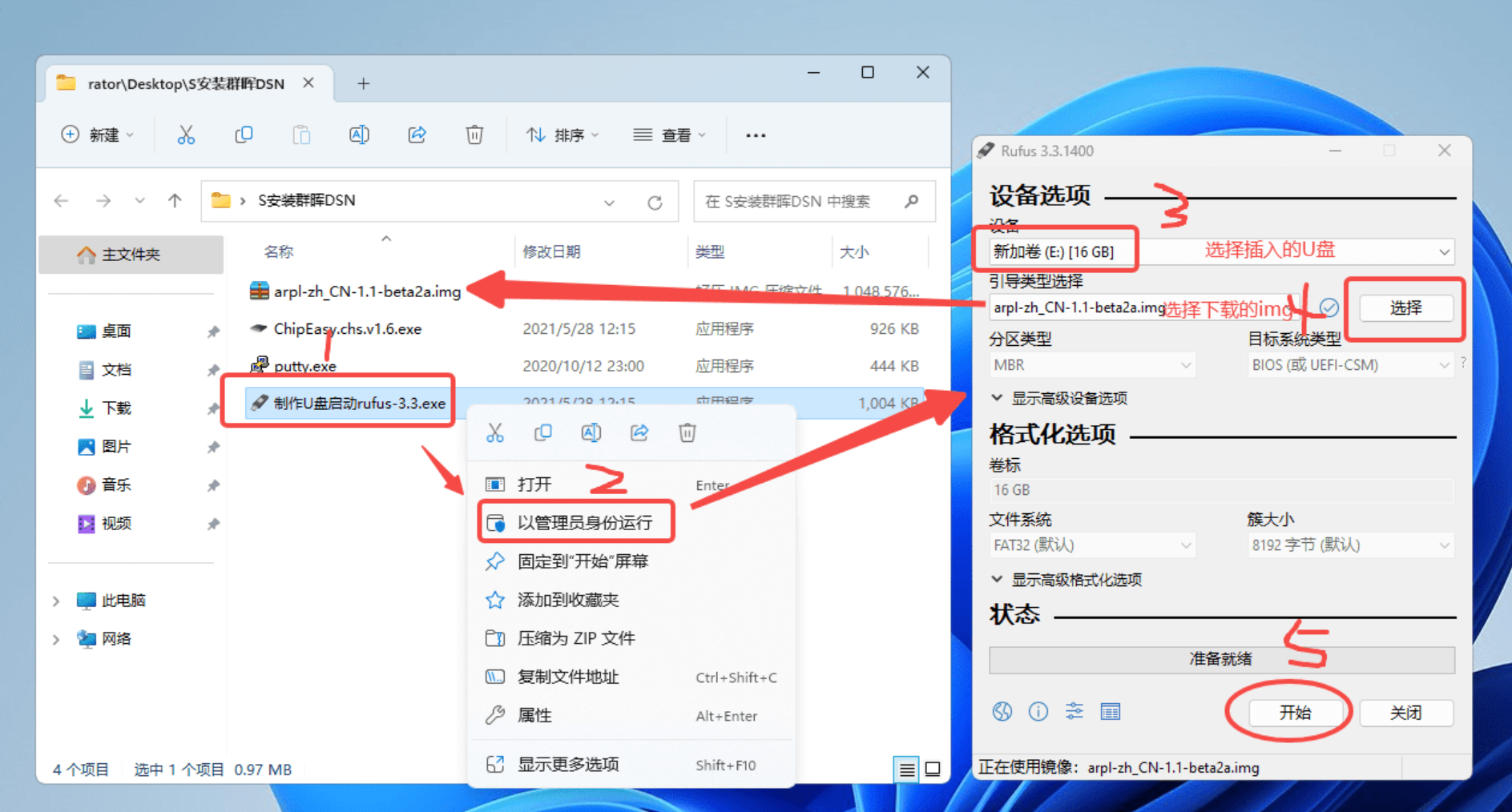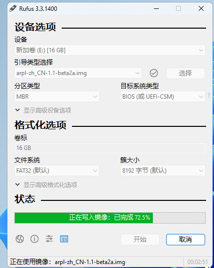 打开拷录工具rufus,选择对应的U盘与所要拷录的文件“*.img”,点击开始,等待完成…