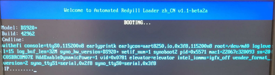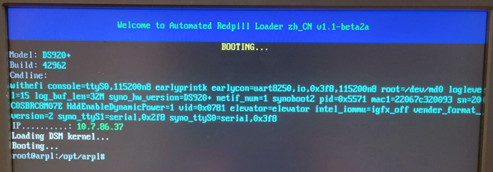 看到”root@arpl…”说引导启动成功,这里可以看到型号DS920+、版本42962、访问IP等信息。
